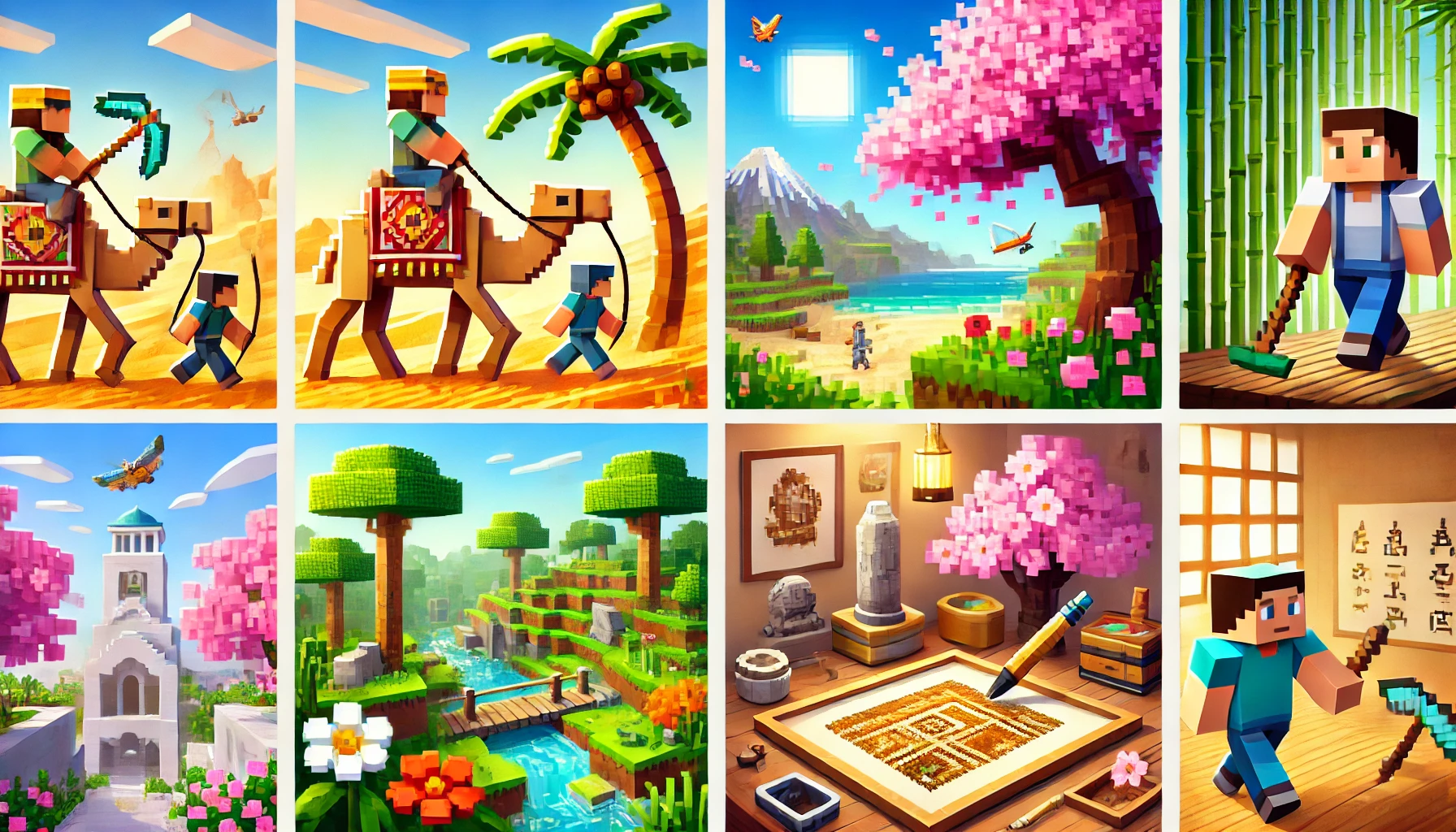 - Черешневий гай: Особливий біом із рожевими деревами, що створює атмосферу затишку й романтики.